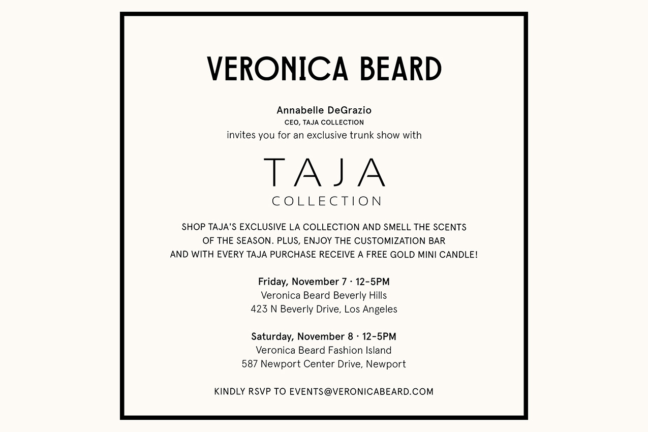 Annabelle DeGrazio, CEO, TAJA COLLECTION, invites you for an exclusive trunk show with TAJA COLLECTION. Shop the exclusive LA collection and smell the scents of the season.