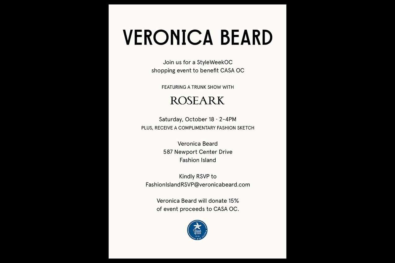 Join Veronica Beard for a StyleWeekOC shopping event benefiting CASA OC, featuring a special trunk show with ROSEARK.