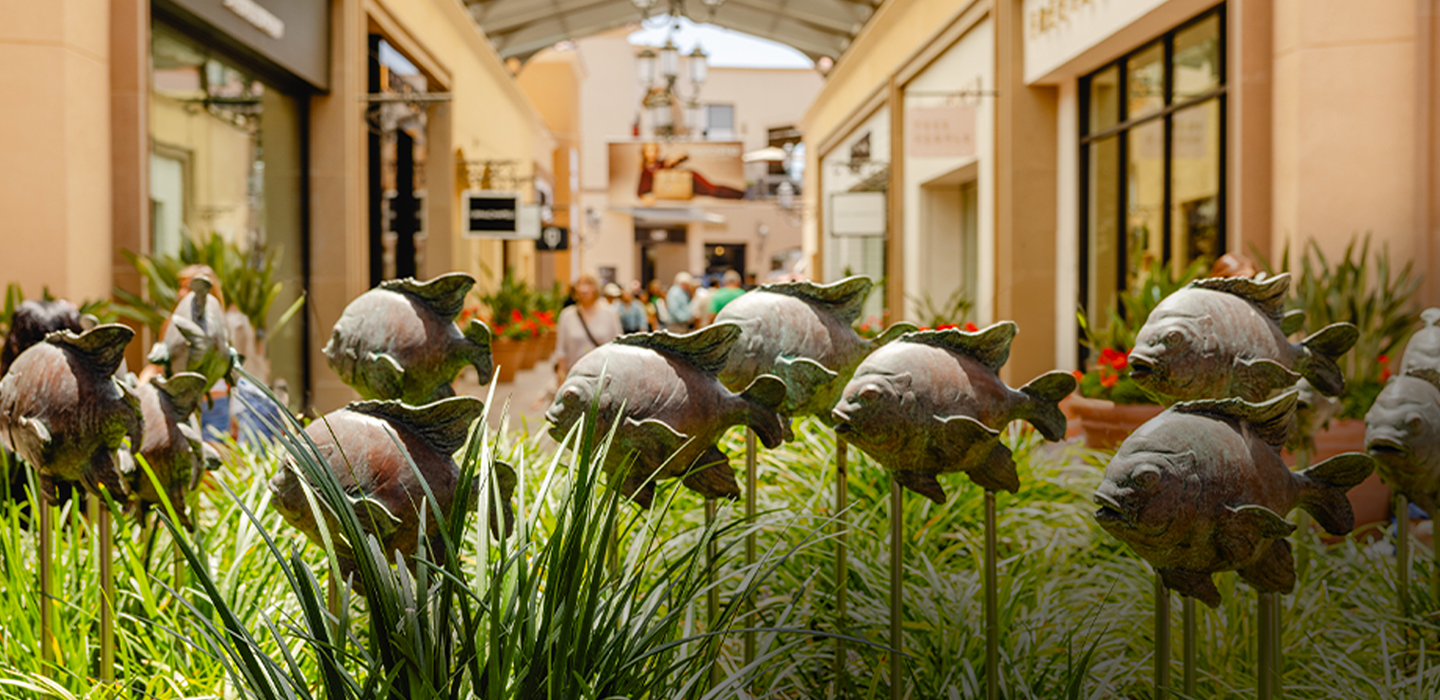The sea-to-shore story of Newport Beach is very much alive in this whimsical sculpture. Here, a wave of bronze fish rises from reed grasses along the Commons promenade, shoals shimmering in the sun. These are not just any fish. But the mighty Garibaldi, California’s state fish and kelp-forest guardian whose vivid hue and territorial spirit make it a coastal icon. The work is by Southern California sculptors T.J. Dixon & James Nelson, installed by award-winning Burton Studio.