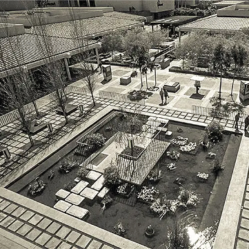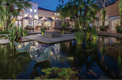 Since 1969, this palm-shaded lagoon has served as both tranquil hideaway and joyful backdrop of photographic moments. The 20,000-gallon oasis was dreamt up by California Mid-Century Modern visionary John F. Galbraith as an immersion of nature and architecture. About 90 colorful koi, spanning a dozen varieties, glide beneath the surface, drawing guests in for a quiet pause between shopping excursions. Peaceful and reflective, it remains our most zen experience.
